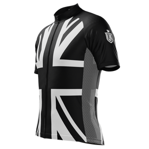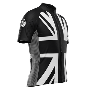 The Men's UK Black & White Flag Short Sleeve Cycling Jersey features a moisture-wicking LEMBO 140 GSM polyester, cooling 110GSM mesh side panels, and reinforced stitched back pockets.