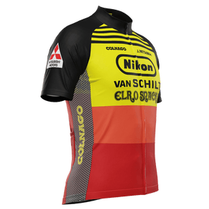 The Men's Van Schilt Retro Short Sleeve Cycling Jersey features a moisture-wicking LEMBO 140 GSM polyester, cooling 110GSM mesh side panels, and reinforced stitched back pockets.