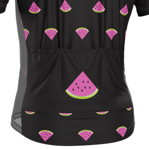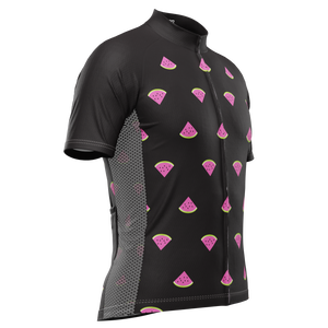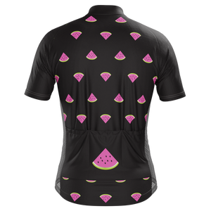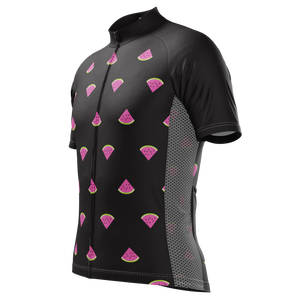 The Men's Watermelon Black Short Sleeve Cycling Jersey features a moisture-wicking LEMBO 140 GSM polyester, cooling 110GSM mesh side panels, and reinforced stitched back pockets.
