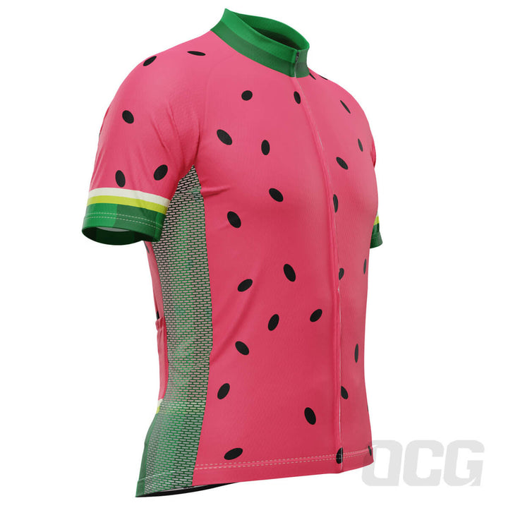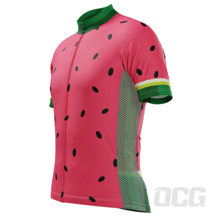 The Men's Watermelon Fruit Short Sleeve Cycling Jersey features a moisture-wicking LEMBO 140 GSM polyester, cooling 110GSM mesh side panels, and reinforced stitched back pockets.