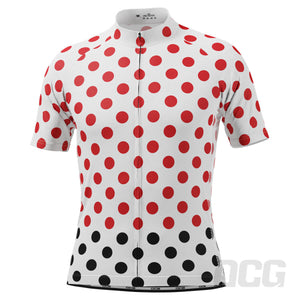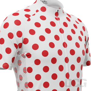 This Men's White Polka Dot Short Sleeve Cycling Jersey is made from high-quality Cool-Max breathable fabric with a hidden full-length zip and three reinforced back pockets.