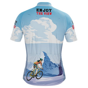 The Men's Why Rush Short Sleeve Cycling Jersey features a moisture-wicking LEMBO 140 GSM polyester, cooling 110GSM mesh side panels, and reinforced stitched back pockets.