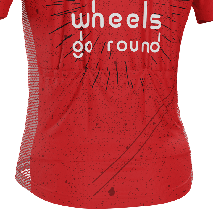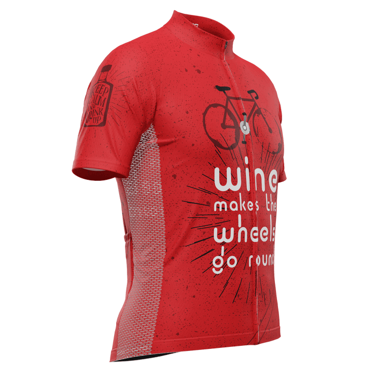 The Men's Wine Makes the Wheels Go Round Short Sleeve Cycling Jersey features a moisture-wicking LEMBO 140 GSM polyester, cooling 110GSM mesh side panels, and reinforced stitched back pockets.