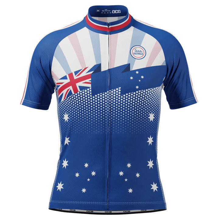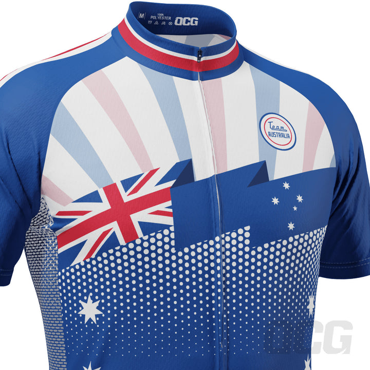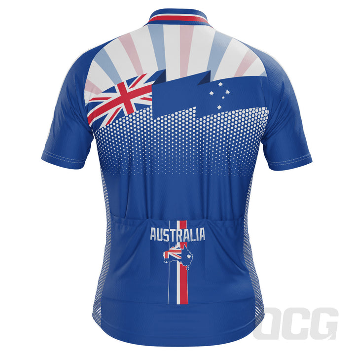The Men's World Countries Flag Australia Short Sleeve Cycling Jersey features a moisture-wicking LEMBO 140 GSM polyester, cooling 110GSM mesh side panels, and reinforced stitched back pockets.