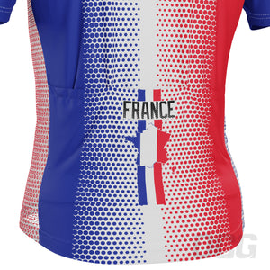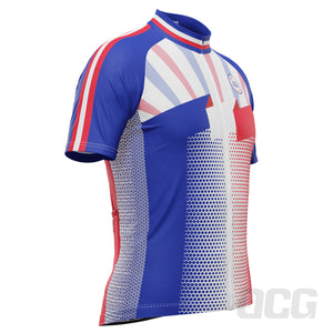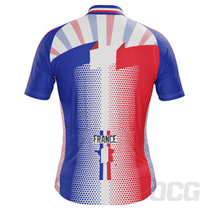 The Men's World Countries Flag France Short Sleeve Cycling Jersey features a moisture-wicking LEMBO 140 GSM polyester, cooling 110GSM mesh side panels, and reinforced stitched back pockets.