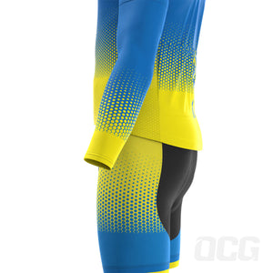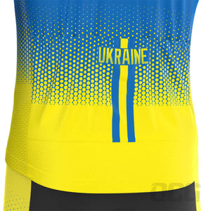 The Men's World Countries Flags Ukraine Short Sleeve Cycling 4 Piece Kit features a moisture-wicking LEMBO 140 GSM polyester jersey body, cooling 110GSM mesh side panels, and reinforced stitched back pockets.