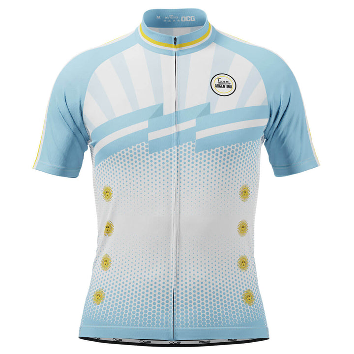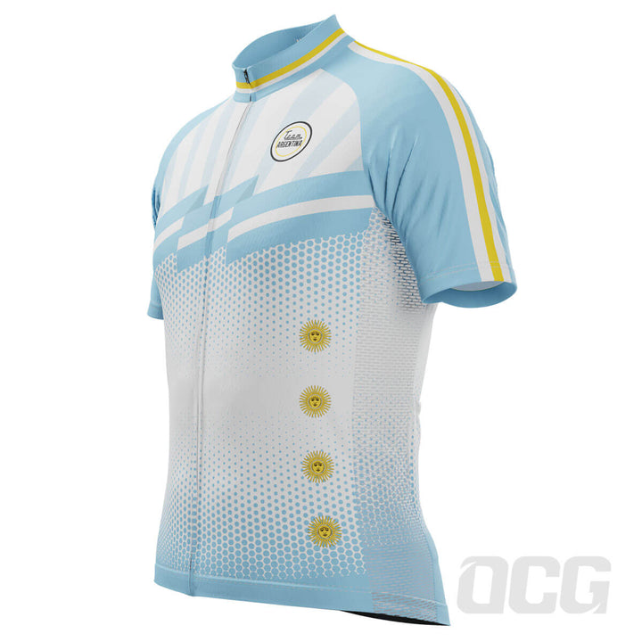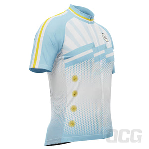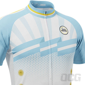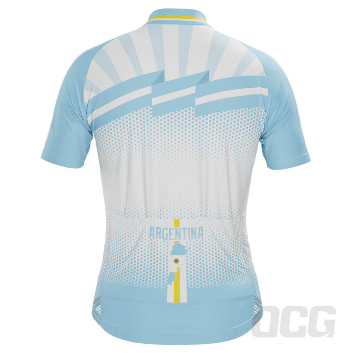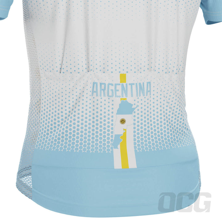 The Men's World Series -Argentina Flag Short Sleeve Cycling Jersey features a moisture-wicking LEMBO 140 GSM polyester, cooling 110GSM mesh side panels, and reinforced stitched back pockets.