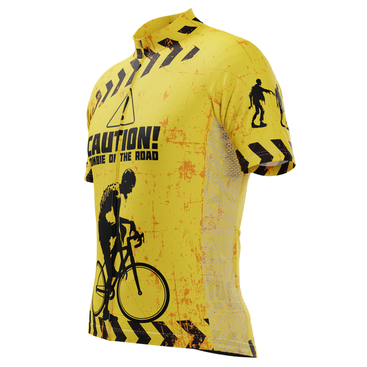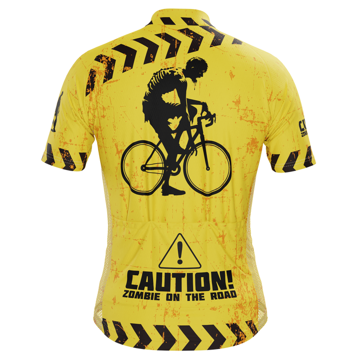 The Men's Zombies Short Sleeve Cycling Jersey features a moisture-wicking LEMBO 140 GSM polyester, cooling 110GSM mesh side panels, and reinforced stitched back pockets.