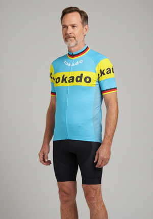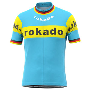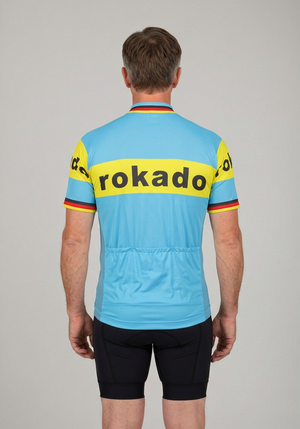 The Retro 1973 Team Rokado German Cycling Jersey brings the classic style of the German professional team of the 1970s to a high-quality Quick-Dry breathable polyester fabric.