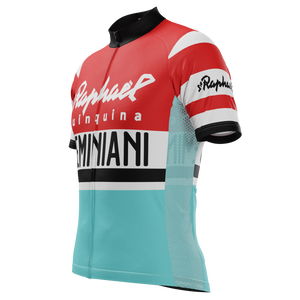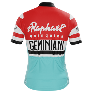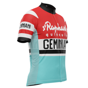The 50s and 60s St Raphael-Geminiani Retro Short Sleeve Cycling Jersey brings memories back of riders such as Brian Robinson, Tom Simpson, Raphaël Géminiani, and Jacques Anquetil.