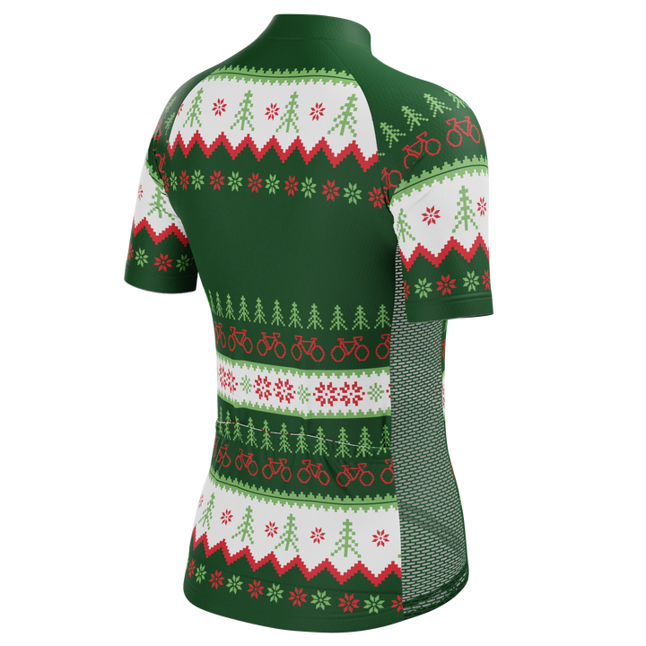 The Women's All I Want For Christmas Short Sleeve Cycling Jersey features a moisture-wicking LEMBO 140 GSM polyester, cooling 110GSM mesh side panels, and reinforced stitched back pockets.