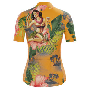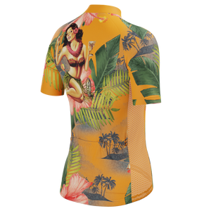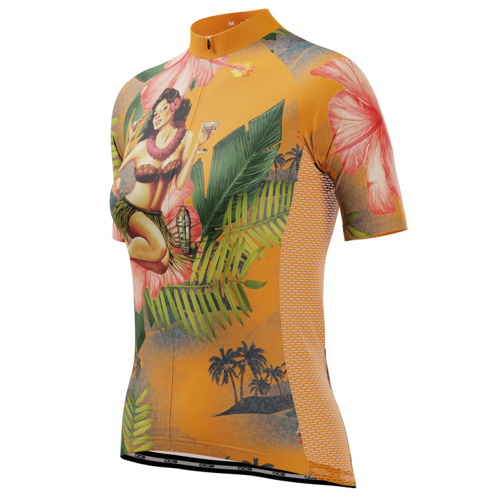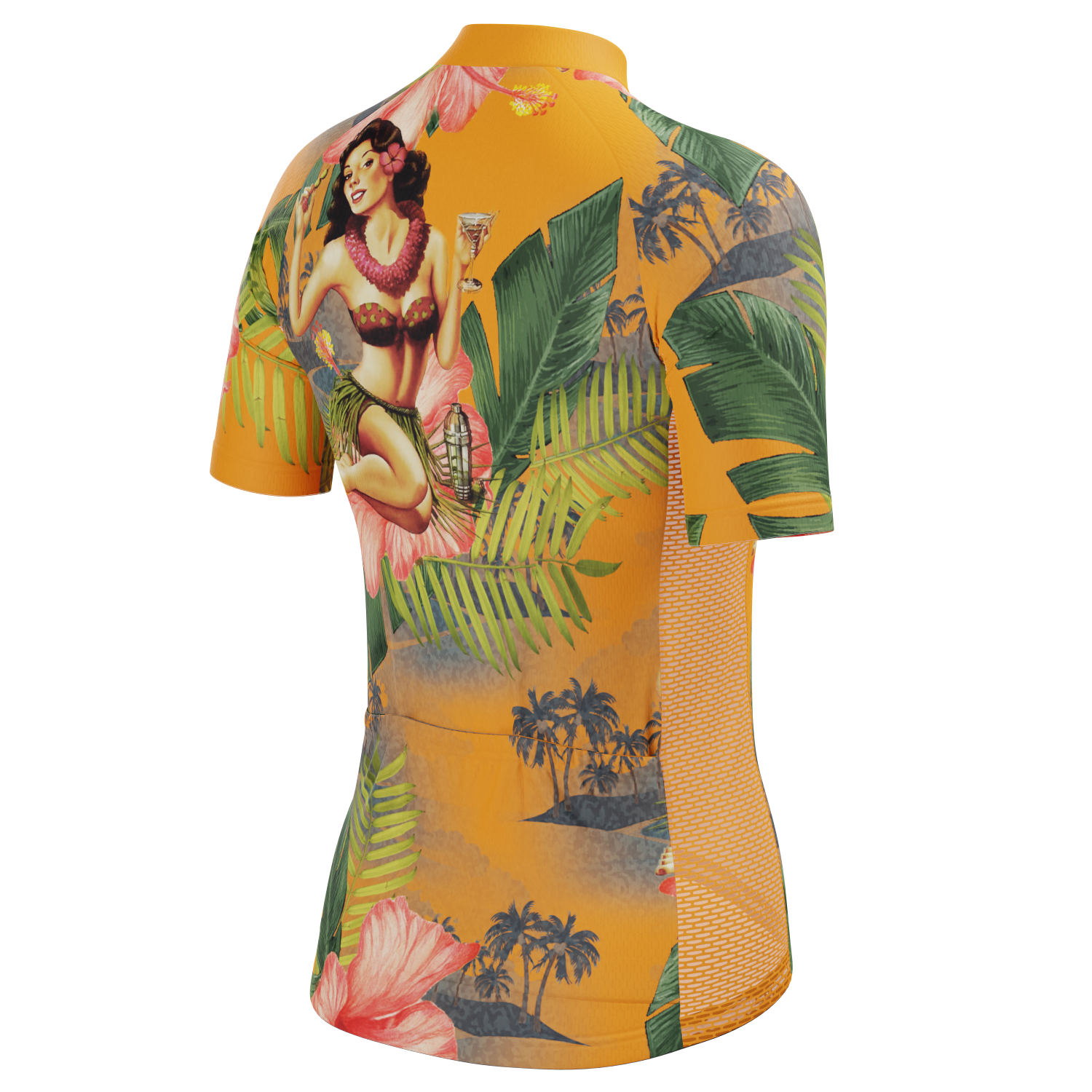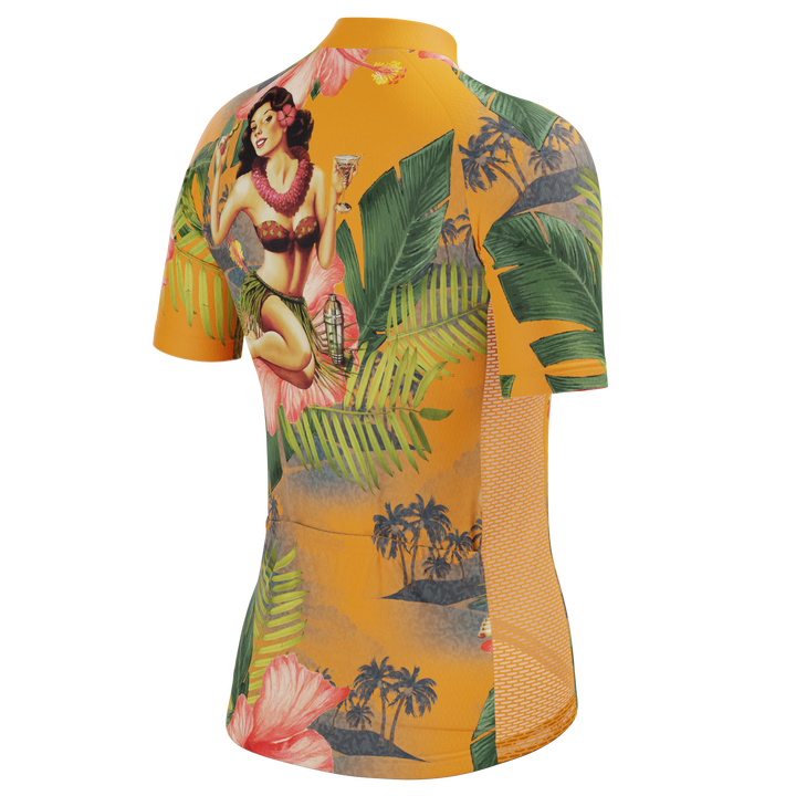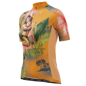 The Women's Aloha Flowers Short Sleeve Cycling Jersey features a moisture-wicking LEMBO 140 GSM polyester, cooling 110GSM mesh side panels, and reinforced stitched back pockets.