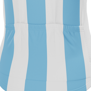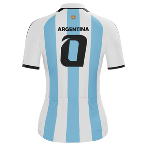 The Women's Argentina Soccer Short Sleeve Cycling Jersey features a moisture-wicking LEMBO 140 GSM polyester, cooling 110GSM mesh side panels, and reinforced stitched back pockets.
