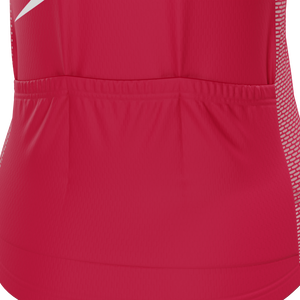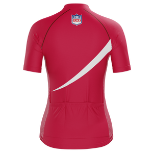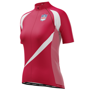 The Women's Arizona Football Short Sleeve Cycling Jersey features a moisture-wicking LEMBO 140 GSM polyester, cooling 110GSM mesh side panels, and reinforced stitched back pockets.