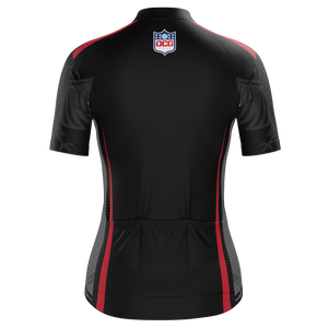 The Women's Atlanta Football Short Sleeve Cycling Jersey features a moisture-wicking LEMBO 140 GSM polyester, cooling 110GSM mesh side panels, and reinforced stitched back pockets.