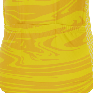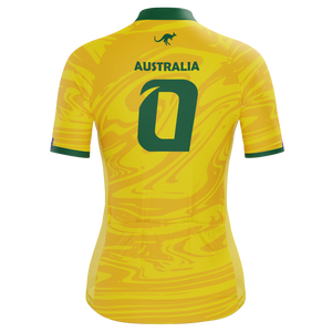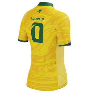 The Women's Australia Soccer Short Sleeve Cycling Jersey features a moisture-wicking LEMBO 140 GSM polyester, cooling 110GSM mesh side panels, and reinforced stitched back pockets.