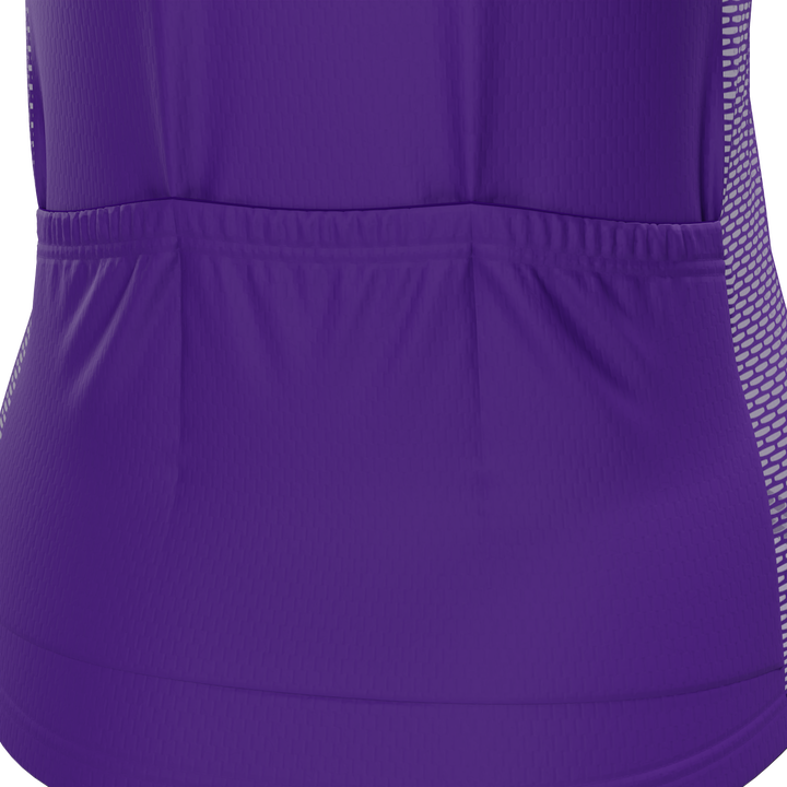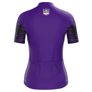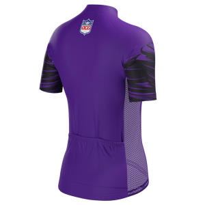 The Women's Baltimore Football Short Sleeve Cycling Jersey features a moisture-wicking LEMBO 140 GSM polyester, cooling 110GSM mesh side panels, and reinforced stitched back pockets.