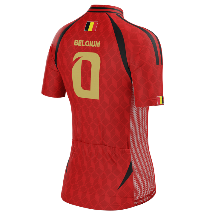 The Women's Belgium Soccer Short Sleeve Cycling Jersey features a moisture-wicking LEMBO 140 GSM polyester, cooling 110GSM mesh side panels, and reinforced stitched back pockets.
