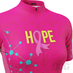 The Women's Breast Cancer Faith Hope Love Short Sleeve Cycling Jersey features a moisture-wicking LEMBO 140 GSM polyester, cooling 110GSM mesh side panels, and reinforced stitched back pockets.