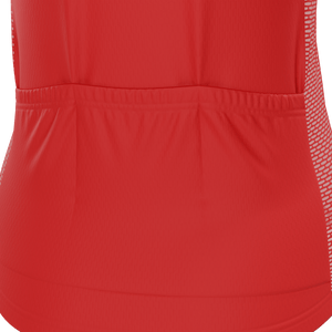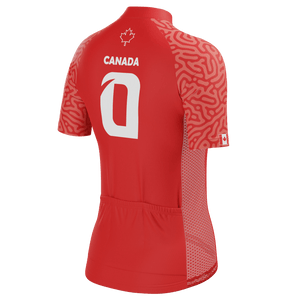 The Women's Canada Soccer Short Sleeve Cycling Jersey features a moisture-wicking LEMBO 140 GSM polyester, cooling 110GSM mesh side panels, and reinforced stitched back pockets.