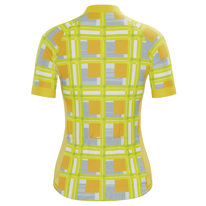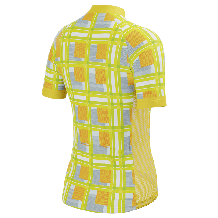 The Women's Criss-Crossed Tartan Short Sleeve Cycling Jersey features a moisture-wicking LEMBO 140 GSM polyester, cooling 110GSM mesh side panels, and reinforced stitched back pockets.