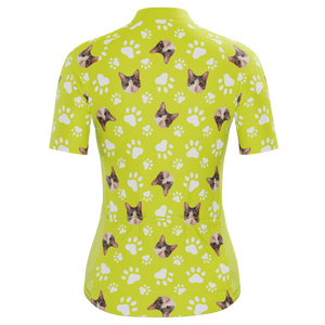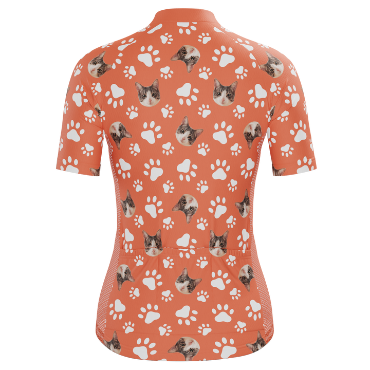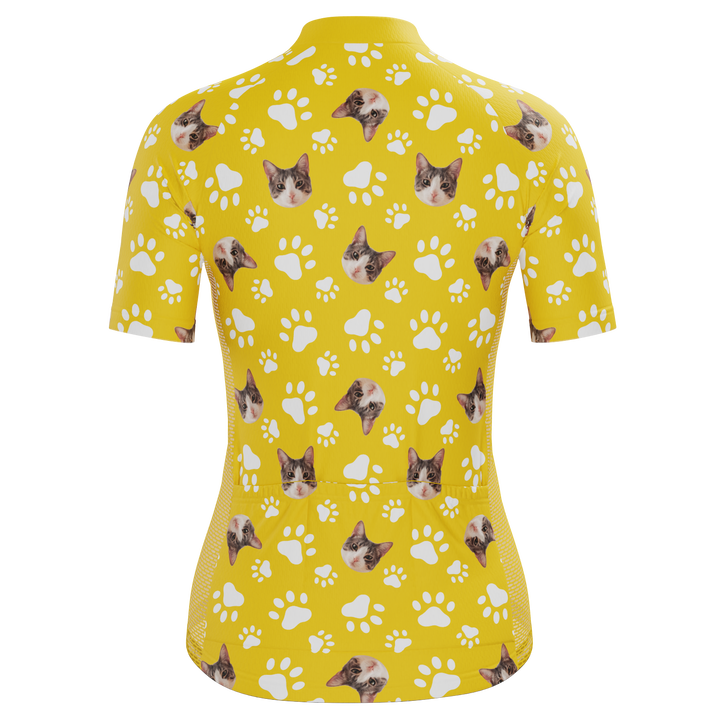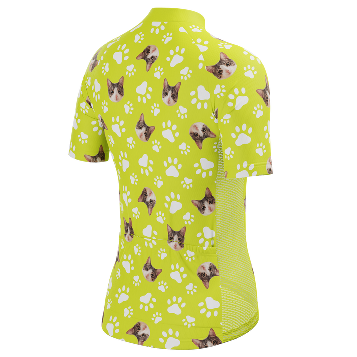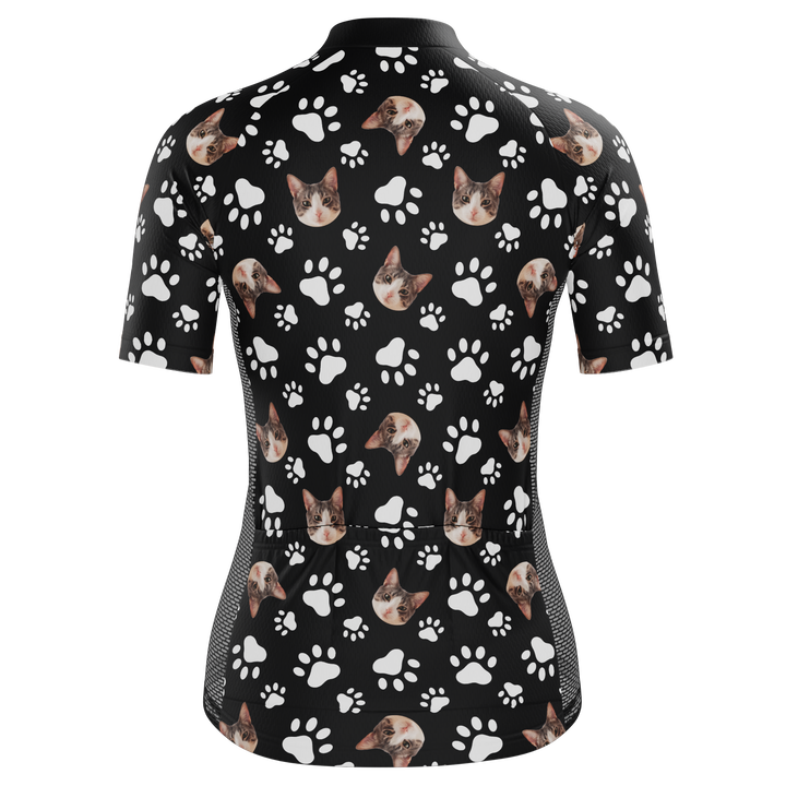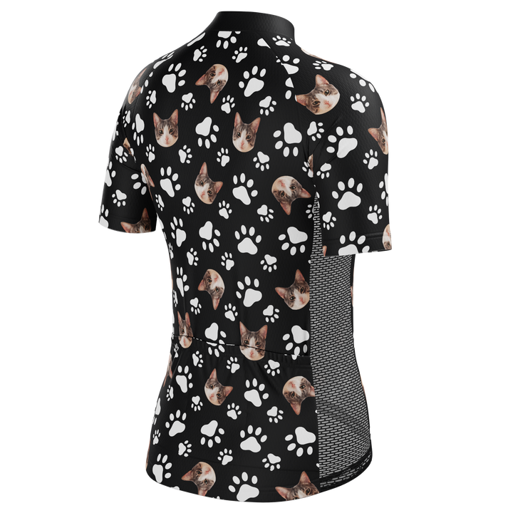 The Women's Custom Pet Paws Design Personalized Short Sleeve Cycling Jersey features a moisture-wicking LEMBO 140 GSM polyester, cooling 110GSM mesh side panels, and reinforced stitched back pockets.