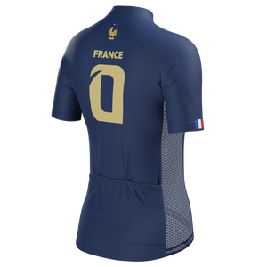 The Women's France Soccer Short Sleeve Cycling Jersey features a moisture-wicking LEMBO 140 GSM polyester, cooling 110GSM mesh side panels, and reinforced stitched back pockets.