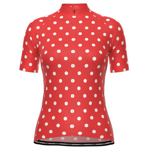 The Women's High Visibility Polka Dot Cycling Jersey lets you ride in style and feel the comfort of a jersey cut for the women's body shape.