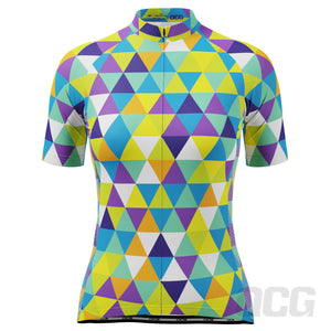 The Women's High Viz Color Triangles Short Sleeve Cycling Jersey features a moisture-wicking LEMBO 140 GSM polyester, cooling 110GSM mesh side panels, and reinforced stitched back pockets.