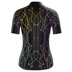 The Women's Holographic Circuit Short Sleeve Cycling Jersey features a moisture-wicking LEMBO 140 GSM polyester, cooling 110GSM mesh side panels, and reinforced stitched back pockets.