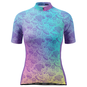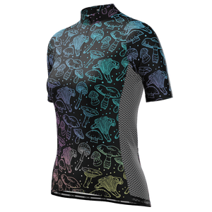 The Women's Holographic Mushrooms Short Sleeve Cycling Jersey features a moisture-wicking LEMBO 140 GSM polyester, cooling 110GSM mesh side panels, and reinforced stitched back pockets.