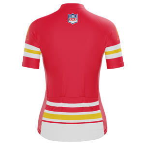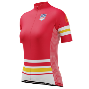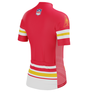 The Women's Kansas Football Short Sleeve Cycling Jersey features a moisture-wicking LEMBO 140 GSM polyester, cooling 110GSM mesh side panels, and reinforced stitched back pockets.