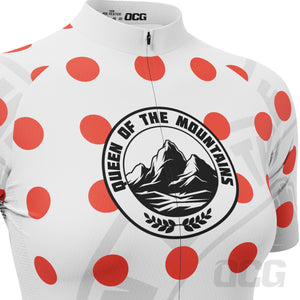 The Women's Queen of the Mountains Polka Dot Short Sleeve Cycling Jersey features a moisture-wicking LEMBO 140 GSM polyester, cooling 110GSM mesh side panels, and reinforced stitched back pockets.
