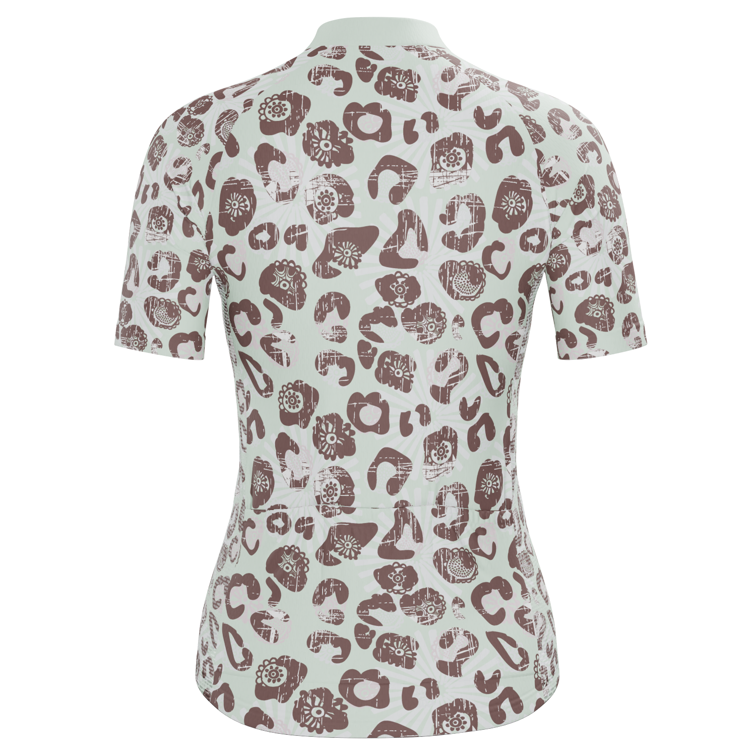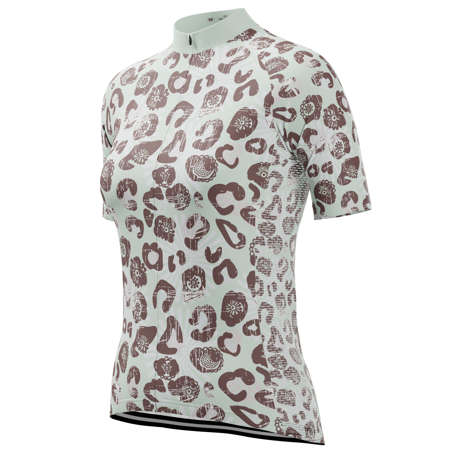 The Women's Leopard Skin Green Gel Padded Cycling Jersey features a moisture-wicking LEMBO 140 GSM polyester, cooling 110GSM mesh side panels, and reinforced stitched back pockets.