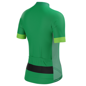 The Women's Leprechaun Short Sleeve Cycling Jersey features a moisture-wicking LEMBO 140 GSM polyester, cooling 110GSM mesh side panels, and reinforced stitched back pockets.