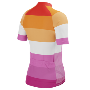 The LGBT Lesbian Pride Short Sleeve Cycling Jersey features a moisture-wicking LEMBO 140 GSM polyester, cooling 110GSM mesh side panels, and reinforced stitched back pockets.
