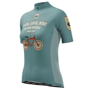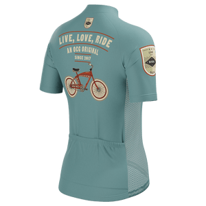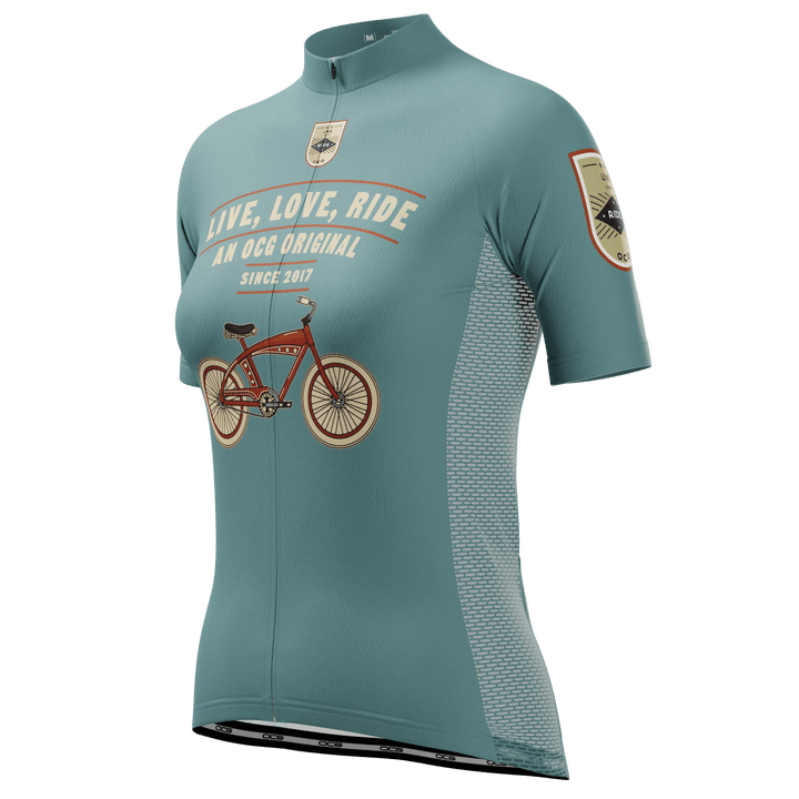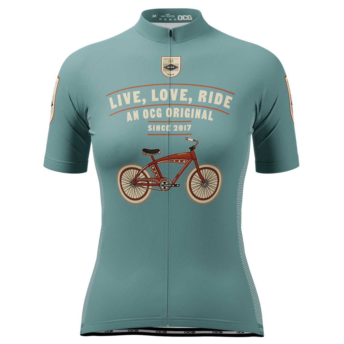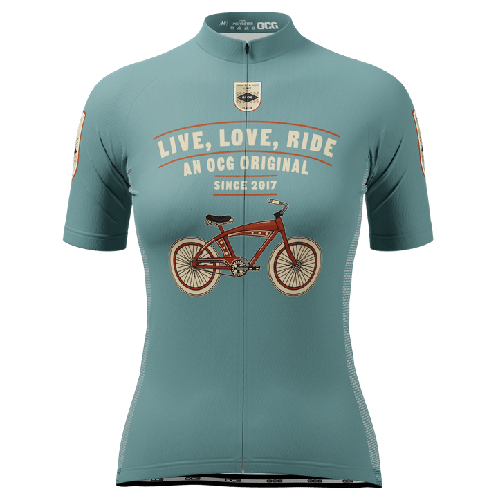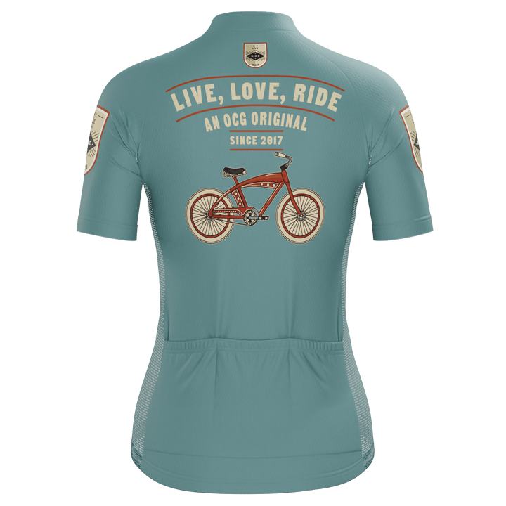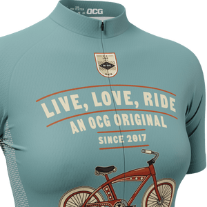 OCG presents the Women's Live, Love, Ride, Retro Short Sleeve Cycling Jersey so you can roll up to your next ride in style and feel the comfort of a female cut jersey.
