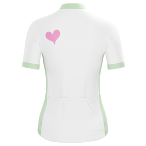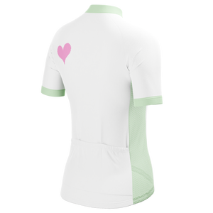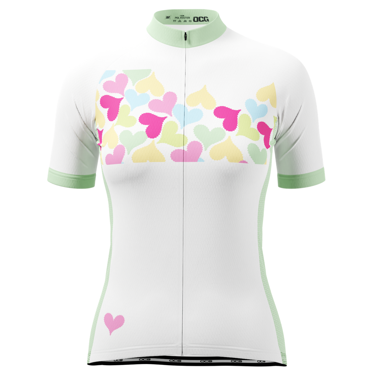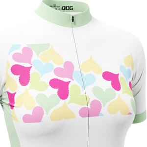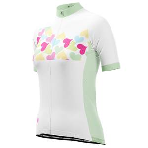The Women's Love Hearts Short Sleeve Cycling Jersey lets you ride in style and feel the comfort of a jersey cut for the women's body shape.