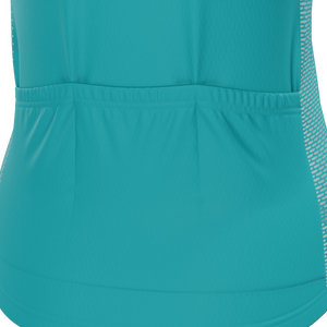 The Women's Miami Football Short Sleeve Cycling Jersey features a moisture-wicking LEMBO 140 GSM polyester, cooling 110GSM mesh side panels, and reinforced stitched back pockets.