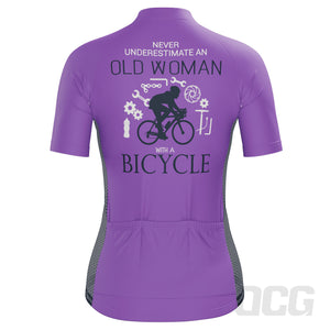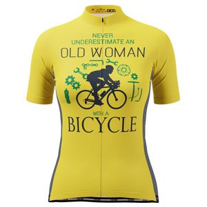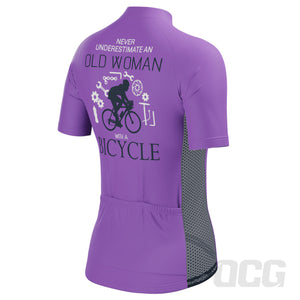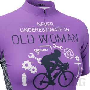 OCG and OCG Originals have come together to bring the Women's Never Underestimate an Old Woman on a Bicycle Short Sleeve Cycling Jersey so you can roll up to your next ride in style and feel the comfort of a female cut jersey.