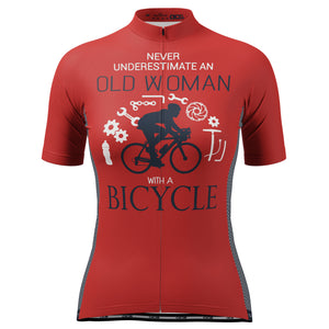 The Women's Never Underestimate an Old Woman on a Bicycle Short Sleeve Cycling Jersey features a moisture-wicking LEMBO 140 GSM polyester, cooling 110GSM mesh side panels, and reinforced stitched back pockets.