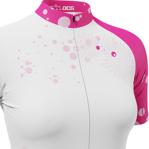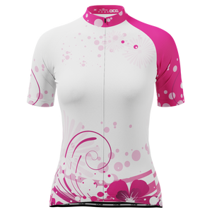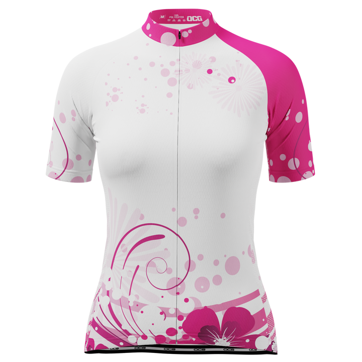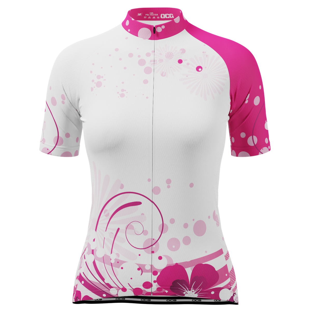 OCG presents the Women's Pink Floral Swirl Short Sleeve Cycling Jersey so you can roll up to your next ride in style and feel the comfort of a female cut jersey.
