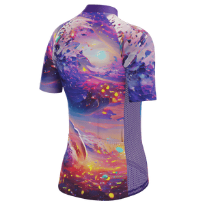 The Women's Planets Short Sleeve Cycling Jersey features a moisture-wicking LEMBO 140 GSM polyester, cooling 110GSM mesh side panels, and reinforced stitched back pockets.
