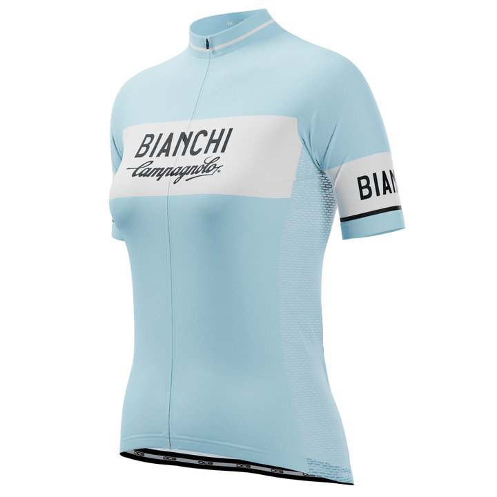 The Women's Retro Bianchi Short Sleeve Cycling Jersey features a moisture-wicking LEMBO 140 GSM polyester, cooling 110GSM mesh side panels, and reinforced stitched back pockets.