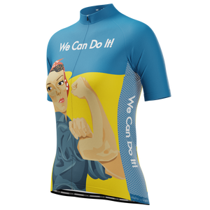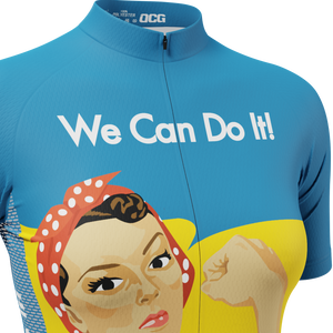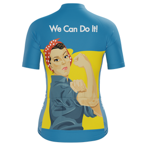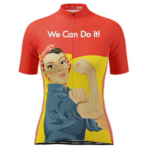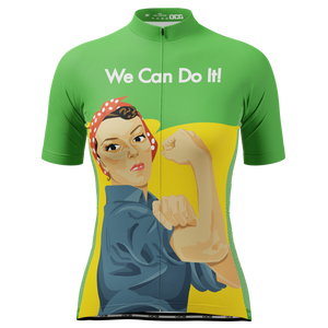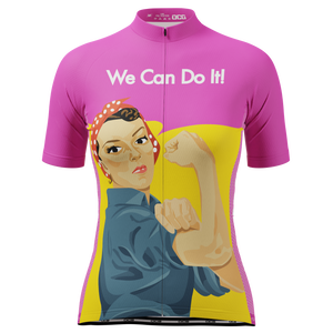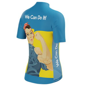 The Women's Rosie Riveter Short Sleeve Cycling Jersey features a moisture-wicking LEMBO 140 GSM polyester, cooling 110GSM mesh side panels, and reinforced stitched back pockets.