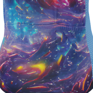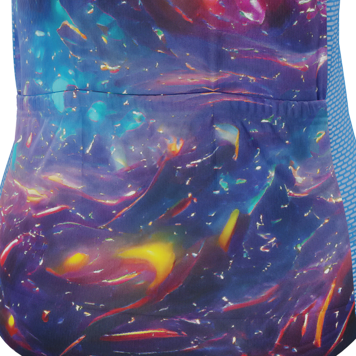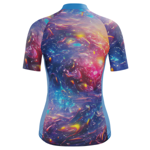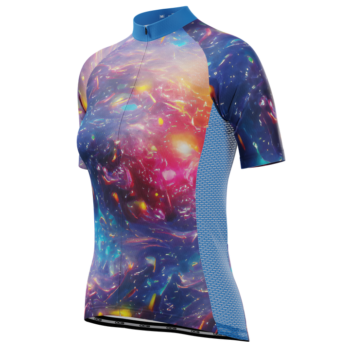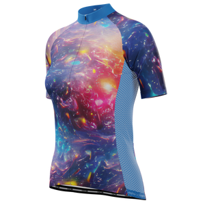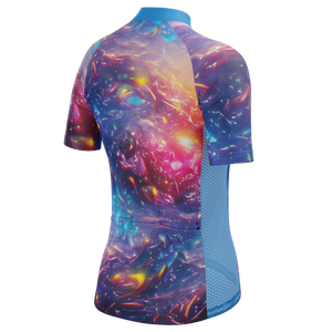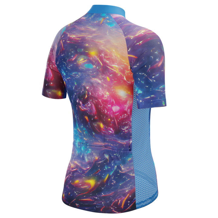 The Women's Stars Short Sleeve Cycling Jersey features a moisture-wicking LEMBO 140 GSM polyester, cooling 110GSM mesh side panels, and reinforced stitched back pockets.