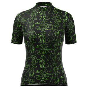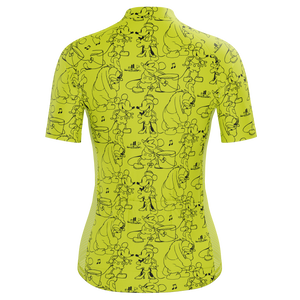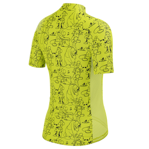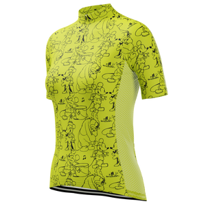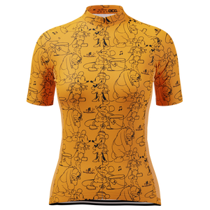 The Women's Steamboat Willie Sketches Short Sleeve Cycling Jersey features a moisture-wicking LEMBO 140 GSM polyester, cooling 110GSM mesh side panels, and reinforced stitched back pockets.