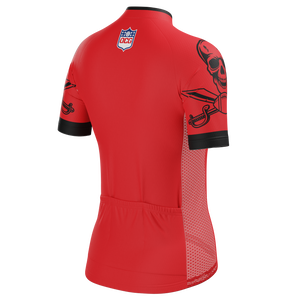 The Women's Tampa Football Short Sleeve Cycling Jersey features a moisture-wicking LEMBO 140 GSM polyester, cooling 110GSM mesh side panels, and reinforced stitched back pockets.