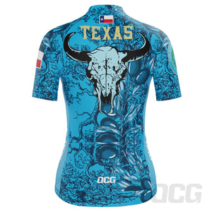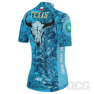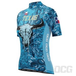 The Women's Texas Longhorn Short Sleeve Cycling Jersey features a moisture-wicking LEMBO 140 GSM polyester, cooling 110GSM mesh side panels, and reinforced stitched back pockets.