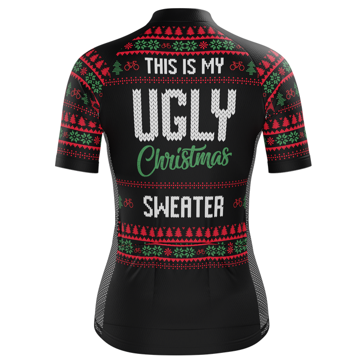 The Women's This is my Ugly Christmas Sweater Short Sleeve Cycling Jersey features a moisture-wicking LEMBO 140 GSM polyester, cooling 110GSM mesh side panels, and reinforced stitched back pockets.